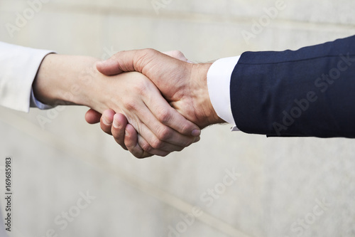 horizontal, photo, color image, outdoors, day, two people, part of, missy, half face, business, business suit, city, urban, businesswoman, businessman, colleague, city life, communication, meeting, shaking hands, planning