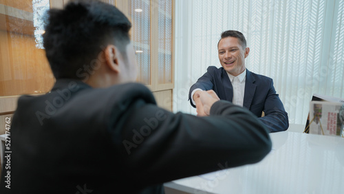 Business concept of 4k Resolution. The manager is having a meeting with a partner in the office. Congratulations handshake due to successful work.