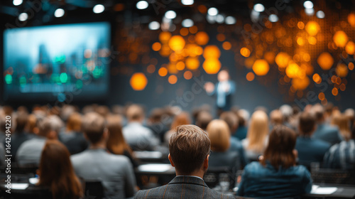 conference, presenter, modern, meeting, room, projection, graphic, city landscape, professional, atmosphere, collaborative, business, event, corporate, audience, seated, paper, warm, lighting, natural, overcast, sky, gesticulate, abstract, colourful, shape, accent, wall