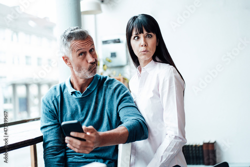 business, couple, face, hot drink, shop, smartphone, people, communication, adult, woman, man, day, businessman, businesswoman, occupation, job, colleague, standing, sitting, mobile, phone, pulling, funny, facial, expression, grimace, puckering, humor, teasing, mature, holding, caucasian, cafes, entrepreneur, owner, female, male