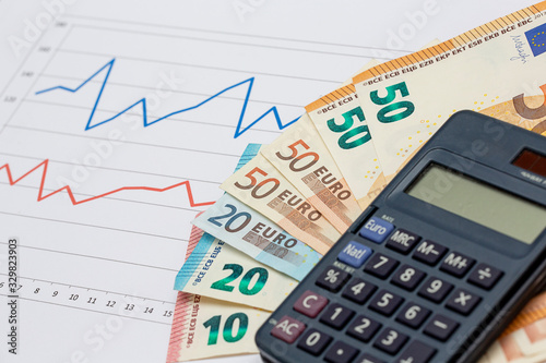 Business crisis and economic crisis concept image. Pile of Euro banknotes with calculator on analysis and data sheets.