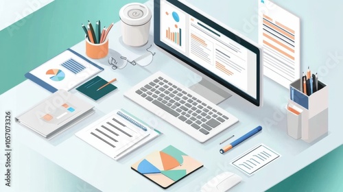 Business desk at home illustration, featuring a modern desk setup with computer and stationery