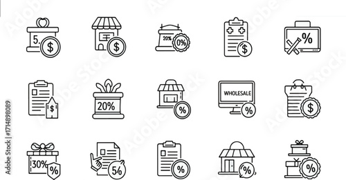 Business discount icons set vector line style wholesale retail offer coupon sale promotion percentage shop deal commerce graphic design