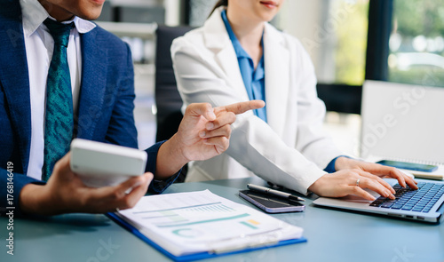 Business documents on office table with smart phone and calculator digital tablet and graph business with social network diagram and two colleagues discussing data working in the office