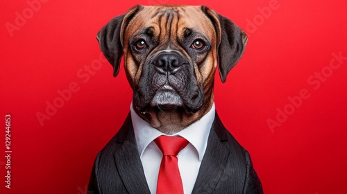 dog, business, suit, red, formal, professional, animal, portrait, boxer, corporate, attire, dressed, unique, humorous, stylish, executive, confident, fashion, pet, character, creative, fun, vibrant, impressive, photo, illustration, stock, mascot, friendly, charismatic, serious, playful, expression
