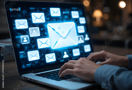 Business Email Communication and Digital Messaging Network – Hands Typing on Laptop with Email Icons Representing Modern Online Communication and Technology