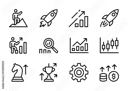 Business Growth and Strategic Innovation Line Icons – Rocket Launch, Trophy, Chess Piece, and Progress Symbols