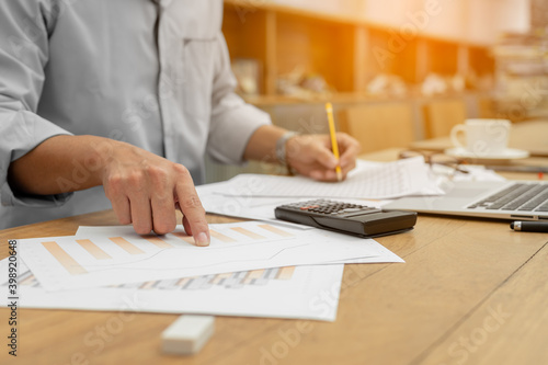 Business hands pointing for checking report chart. Businessman analyzing financial report company and calculate profit with report summary.