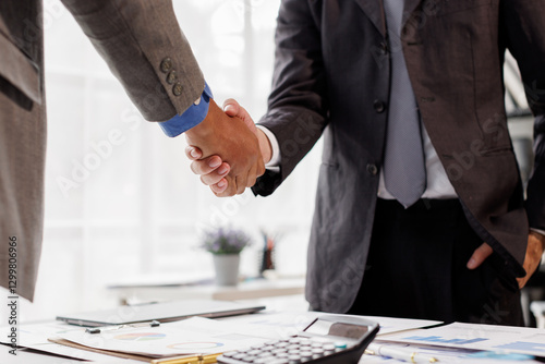 Business handshake congratulate success,two businessman shake hand with partner to celebration partnership and business deal concept