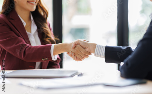 Business handshake for teamwork of business merger and acquisition,successful negotiate,hand shake,two business shake hand with partner to celebration partnership and business deal concept