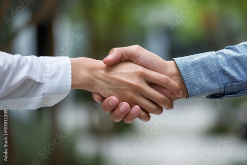 Business handshake on bright background, Two businessman shake hand with partner to celebration partnership and business deal concept.