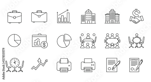 business, icon, line, art, graph, building, handshake, chart, meeting, table, printer, contract, briefcase, simple, minimal, design, office, finance, growth, money, work, team, agreements, document, management