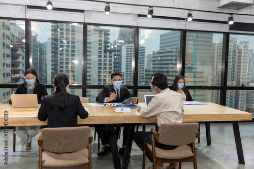 Business in new normal. Office workers wearing face mask and protection while having internal meeting for new business strategy or plan. Technology for new normal