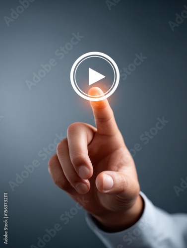 Business Kickoff - Finger Pressing Play Button for Start-Up Pitch on Clean Screen with Copy Space