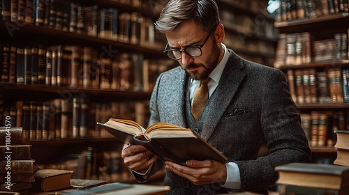 man, businessman, lawyer, lawyer, professional, expert, research, book, library, shelf, cognition, study, education, law, legal, code, business, presentation, meeting, client, office, indoor, interior, background, concept, symbol, copy, space, suit, attaching, goggles, desk, table, chair, wooden, vintage, classic, intellectual, authority, power, advice, contract, court, case, evidence, solution, strategy, service