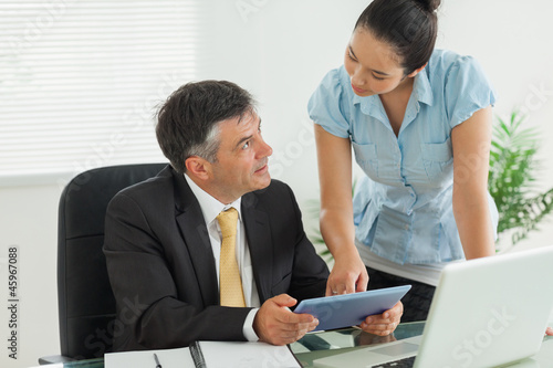 50s, mature adult, man, male, caucasian, young adult, woman, female, indoor, looking away, businessperson, communication, explaining, interaction, meeting, together, working, businesswoman, executive, suit, well-dressed, jacket, sitting, office, workplace, desk, notepad, laptop, chair, table, smiling, happy, shirt, teamwork, businessman, businessperson, talking, discussing, speaking, pointing