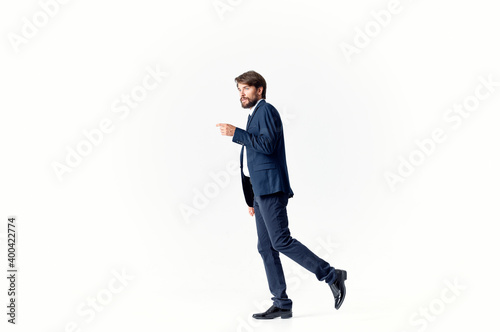 business man in a suit and shoes walks to the side on a light background Copy Space
