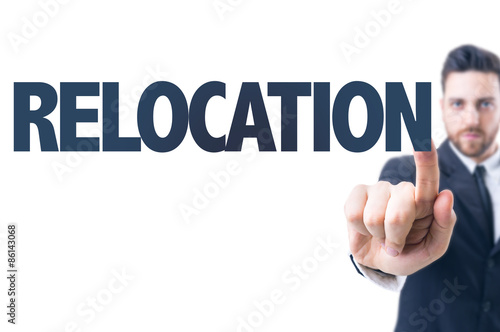 Business man pointing the text: Relocation