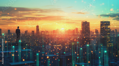business man stands on the peak of success amid tall innovative Smart city with connection network reciprocity over the cityscape social media networking systems that connects on the peak of succes