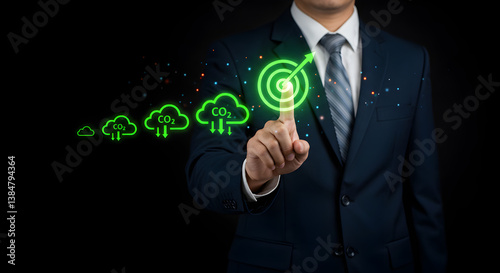 Business Man Touching Green Target Symbol Displaying Cloud Computing and Data Transfer on Black Background