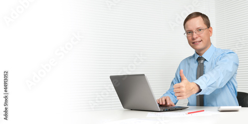 adult, banking, business, businessman, businessperson, career, caucasian, communication, computer, desk, expression, face, gesture, gesticulate, goggles, photogenic, indoor, cyberspace, job, laptop, looking, male, man, manager, modern, notebook, occupation, office, person, portrait, professional, smile, success, table, technology, thumb, web, white, work, men at work, web, young