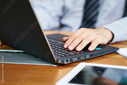 hand, finger, laptop, computer, notebook, businessman, working, businessman, person, businessperson, using, closeup, office worker, people, businessperson, asian, chinese, tied-up, white-collar, 1, sitting, desk, selective focus