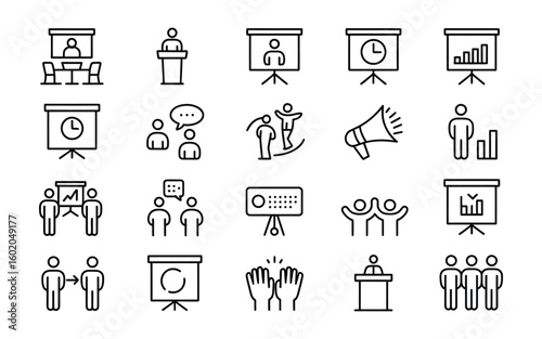 Business Meeting & Presentation Icons Vector Set: Conference, Public Speaking, Training & Success - Line Art Collection