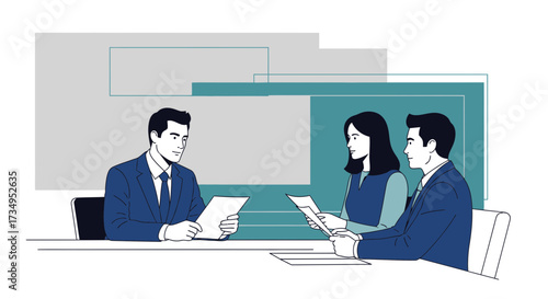 Business Meeting Illustration Featuring Three Professionals Reviewing Documents in Collaboration