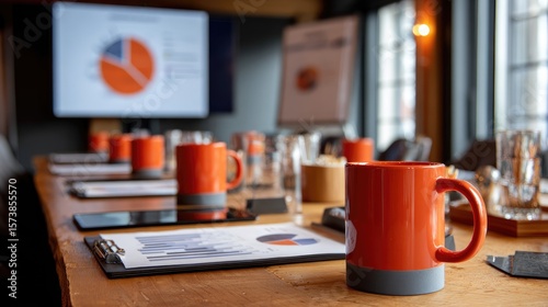 Business meeting setup with coffee mugs, pie charts, and digital screens