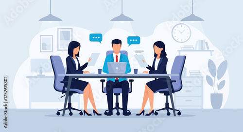 business, meeting, office, professional, teamwork, collaboration, discussion, strategy, planning, corporate, employee, colleague, communication, presentation, laptop, document, chair, table, modern, illustration, vector, workspace, desk, computer, clock, bookshelf, plant