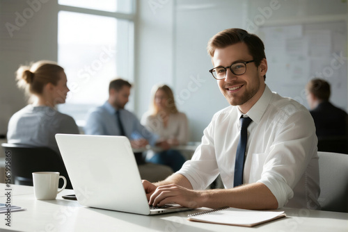 business, meeting, work, laptop, office, professional, employee, caucasian, man, adult, smiling, goggles, formal, dress, shirt, attaching, working, productivity, collaboration, technology, computer, digital, communication, team, people, success, career, entrepreneur, leadership, modern, businessperson, focused, workplace