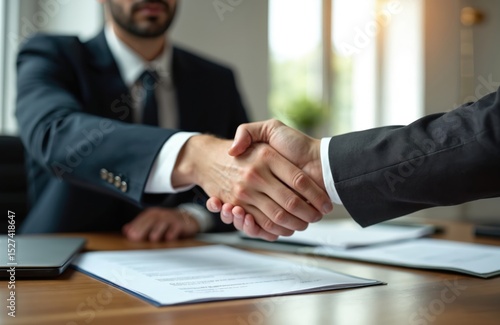Business partners shake hands in office. Two men make deal after contract signing, handshake symbol of agreement. Successful partnership, collaboration, teamwork, confidence, trust. Close-up of