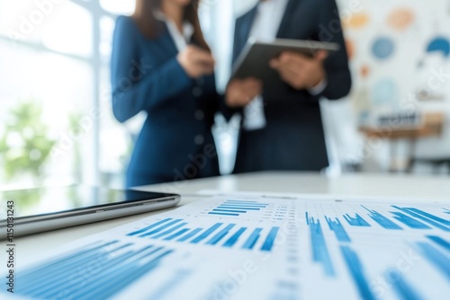 Business partners standing near a whiteboard in a modern office, using a tablet to cross-reference financial graphs with planning notes, dynamic and strategic mood