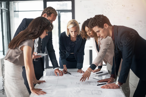 Business people, architect and blueprint in meeting, collaboration and planning for strategy at office. Group of contract engineers in teamwork, floor plan or documents for industrial architecture
