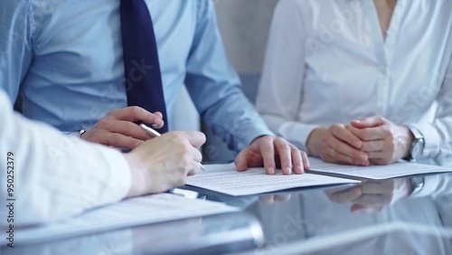 business, contract, agreements, document, office, meeting, people, hand, reading, signing, lawyer, legal, finance, corporate, partnership, deal, teamwork, collaboration, negotiation, pen, paper, table, desk, closeup, professional, businesswoman, businessman, adviser, adviser, executive, man, woman, glasses, sitting, document, ready, discussing, talking, communicating, group, diverse, success, blue, t-shirt, unknown, closeup, lawyer