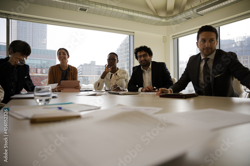smile, business, people, talk, businessman, businesswoman, colleague, cooperation, co-worker, dedication, negotiate, enjoy, group, indoor, listen, man, mid, adult, woman, part of, series, selective focus, to sit, racked, teamwork, togetherness, work, young, meeting, conference room, listening, talking, discussing, brainstorming, paperwork, team
