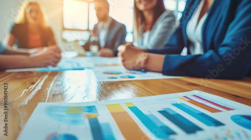 Business people discussing charts and graphs showing results their successful teamwork. Analyzing data, planning, and cooperation in corporate meeting with and conference table in office.