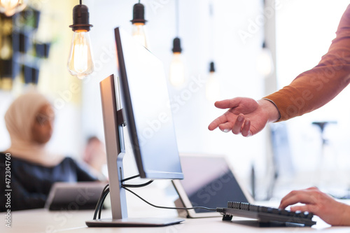 Business people having conversation in modern coworking office space. Ceo giving employee advice. Abstract hand gestures at computer screen.