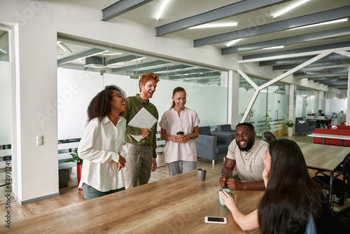 workplace, workspace, office, man, guy, caucasian, black woman, woman, european, corporate, black man, girl, job, management, friends, business, finance, manager, teamwork, smiling, smile, goggles, table, colleague, desk, cooperation, employee, co-worker, team, multiracial, cheerful, mobile phone, mobile phone, smartphone, hot drink, tea, positive, cup, laptop, excited, meeting, laughing, meet, laugh