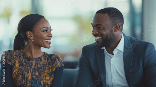 woman, smiling, joy, black, man, beard, suit, jacket, dark, hair, ponytail, dress, pattern, teeth, office, window, light, content, relaxed, meeting, communication, engagement, professional, confident, elegant, gazing, looking, happy, positive, conversation, discussing, business, corporate, interior, sharing, approval, enthusiasm, pleasure, friendly, affection, appreciation, understanding, partnership, collaboration, optimism, connection, warmth, attractive