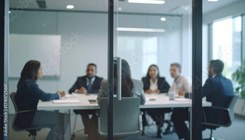 diverse, business, people, negotiate, to sit, conference room, conference, table, behind, closed, glass door, group, private, meeting, team, staff, employee, talk, briefing, negotiate, work, modern, office, boardroom, blurry, colleague, partner, teamwork, concept, businessperson, background