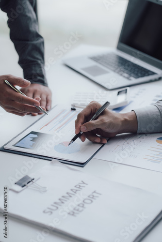 Business people talking about business strategy Collaborate teamwork during discussions on financial and marketing documents, financial data analysis meetings, and in-office charts.