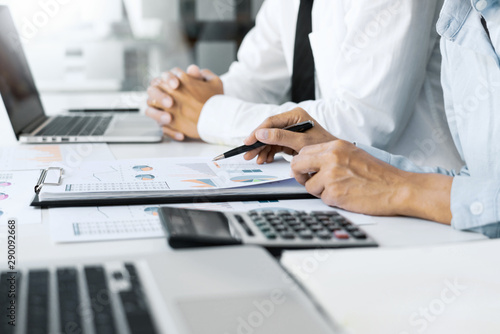 Business People Talking Discussing with coworker planning analyzing financial document data charts and graphs in Meeting and successful teamwork Concept.