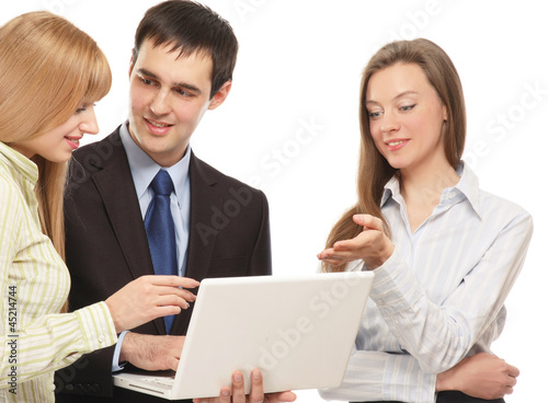 adult, business, businessman, businessperson, businesswoman, tied-up, cooperation, education, expertise, female, group, job, leadership, male, man, meeting, modern, occupation, office, teamwork, togetherness, training, union, oneness, well-being, white, woman, men at work, working, young, standing, portrait, formal, style, confident, successful, satisfied, satisfaction, co-worker, associate, friends, colleague, holding, laptop, computer, notebook, showing, isolated