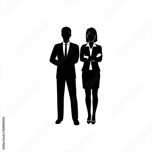 business, professional, silhouette, man, woman, suit, attaching, skirt, blouse, confident, standing, formal, attire, black-and-white, vector, graphic, corporate, teamwork, partnership, career, success, meeting, presentation, office, employee
