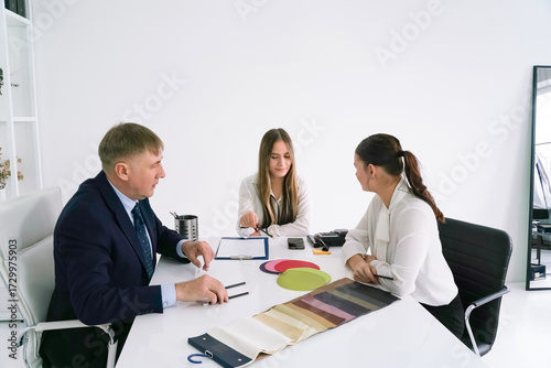 business, professional, collaboration, meeting, office, design, project, color palette, teamwork, creativity, modern, workspace, discussion, planning, interior design, consultation, brainstorming, strategy, document, technology, tool, idea, development, innovation, industry, material, aesthetic, interaction, professionalism, business attire, presentation, sharpened, communication, engagement