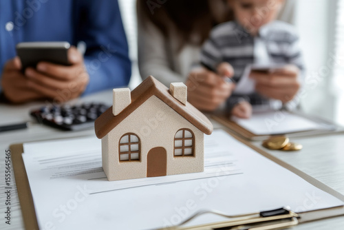 Business professionals finalize real estate agreement in modern office setting during daytime with house model on table