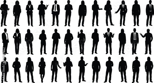 Business professionals silhouette, diverse posture gesture, standing presentation pose, vector illustration, flat design, cad drawing flat vector illustration