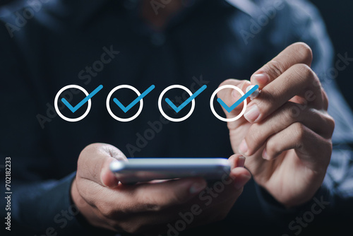 Business project approval concept. Businessman use smartphone with making correct sign mark on checkboxes to approve corporate project.