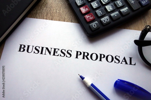 Business proposal document, pen, glasses and calculator on desk